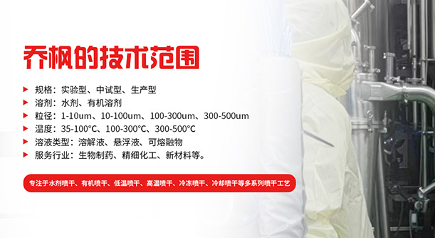 上海喬楓實業有限公司,成立于2012年,是從事噴霧干燥設備的研發設計、生產、銷售(小型噴霧干燥機實驗型噴霧干燥機35℃低溫噴霧干燥機,有機溶劑噴霧干燥機低溫閉式循環噴霧干燥機超細粉末噴霧干燥機、噴霧冷凍干燥機、真空噴霧干燥機、氣流噴霧干燥機,噴霧造粒干燥機,離心噴霧干燥機,沸騰制粒機等)和售后于一體的綜合性公司,本公司現成為一家致力于為生物制藥、精細化工、新能源、陶瓷造粒及食品工程等領域提供全套解決方案的整線交鑰匙工程企業。